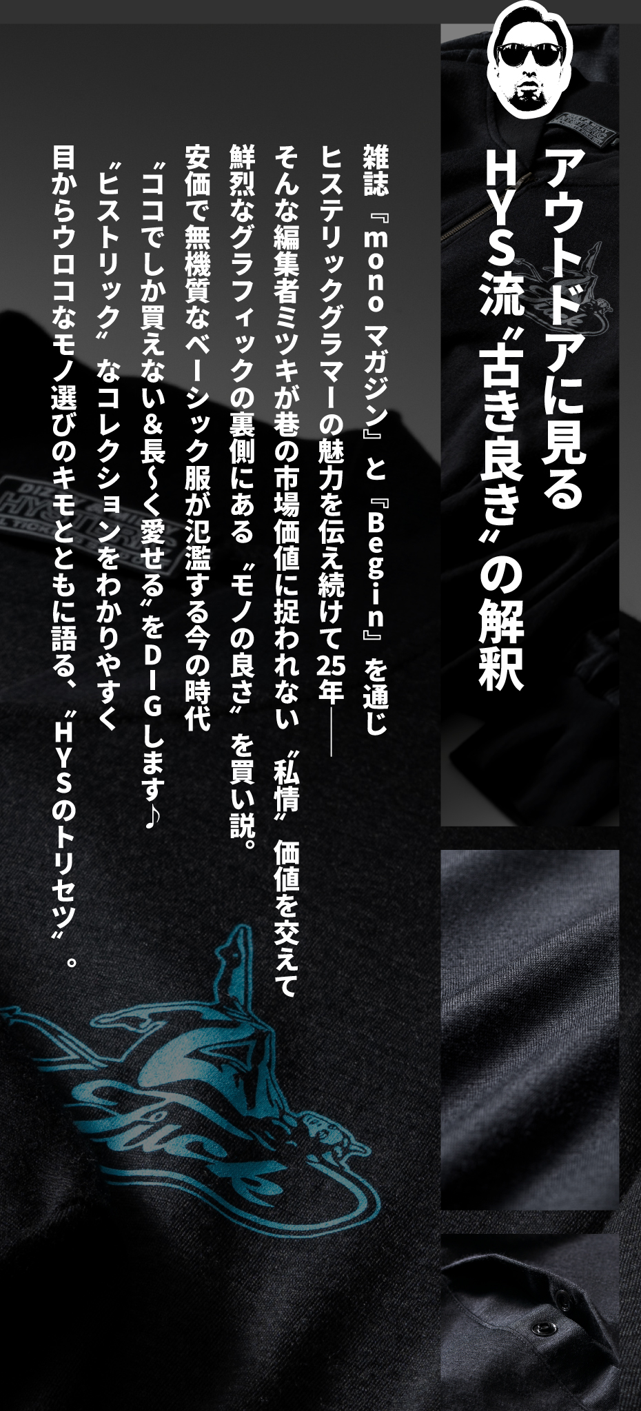 ということで、ウール=防寒というイメージは半分正解で半分誤解。ウールは確かに保温性が高いですが、同時に吸湿性・放湿性が非常に高い天然素材。で、先述したとおり、汗をかいても“臭いにくい”という特徴を持っています。これまでも数々のアウトドアブランドが、数日~一週間着続ける”フィールドテストを行い、合繊とウールの比較テストでも「合繊は数時間で臭う」に対し「一週間のバックパッキングでもほぼ無臭」など、抗菌・防臭性が高いことがさまざまな記事で実証されています。そんな機能を日常に落とし込むのがHYSの真骨頂! ウールの中でも最高級のメリノウールをベースに細番手の糸を高密度に編み込んだ天竺はチクチクせず肌触りがバツグンに滑らか♪着心地のイイ高級Tシャツがカーディガンになった、と形容すればわかりやすいかな。MA-1型のデザインも相まって、着回し力もハンパないのだ。薄くて軽いのに、高密度で編むことでしっかり。防縮加工も施しているから、洗濯機でもガンガン洗えてケアもラクだしね。冒頭にも書いたけれど、古き良きを再現するだけでなく、元の機能を現代のライフスタイルにフィットするかたちで“更新”していくこと。そこにこそ、HYSらしさがある。過去のアウトドアウェアが持っていた合理性や機能美をリスペクトしながらも、街で着ることを前提にシルエットや質感、使い勝手を磨き上げる。だからこそこのウールカーディガンは、「昔ながらの良さ」と「今の快適さ」が矛盾なく共存している。暑い季節にウールなんて……という先入観を軽やかに裏切りつつ、気づけば手放せなくなる一着。こういう“違和感の先にある納得”こそが、長く愛せるモノの条件なのかもしれません。