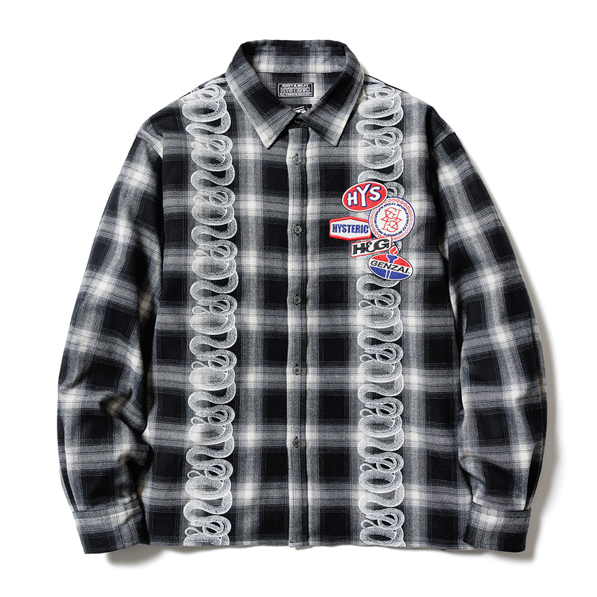 <genzai>のアートディレクター永戸鉄也氏による蛇柄とヒステリックグラマー定番の蛇柄が対になったデザインをチェックシャツやバギーデニムに落とし込んだ他、genzaiの人気アイテム「Big Logo Knit」をアップデートしたアイテムなど、全7型が登場。